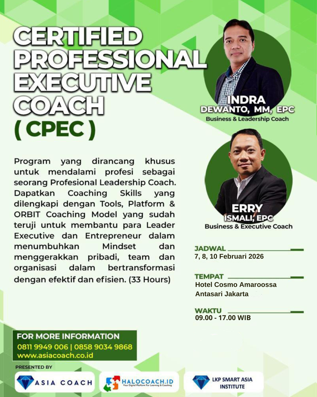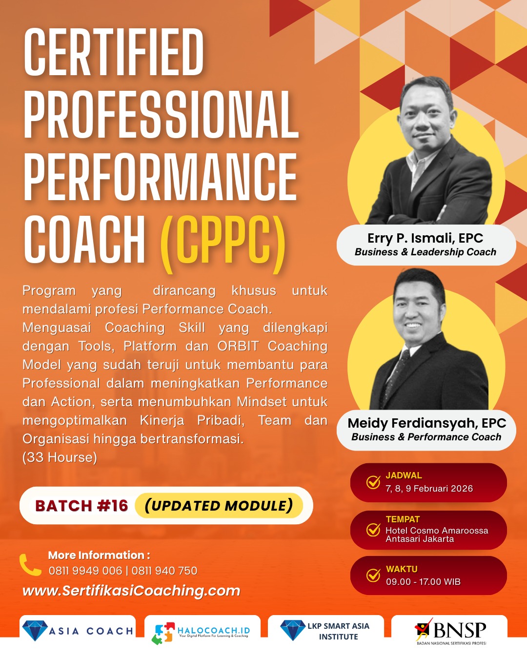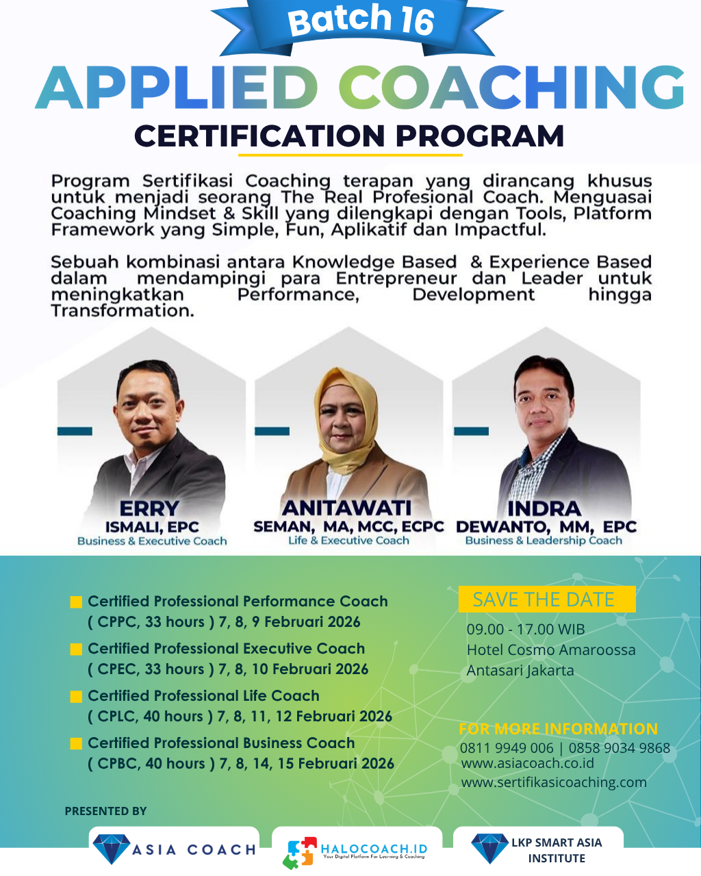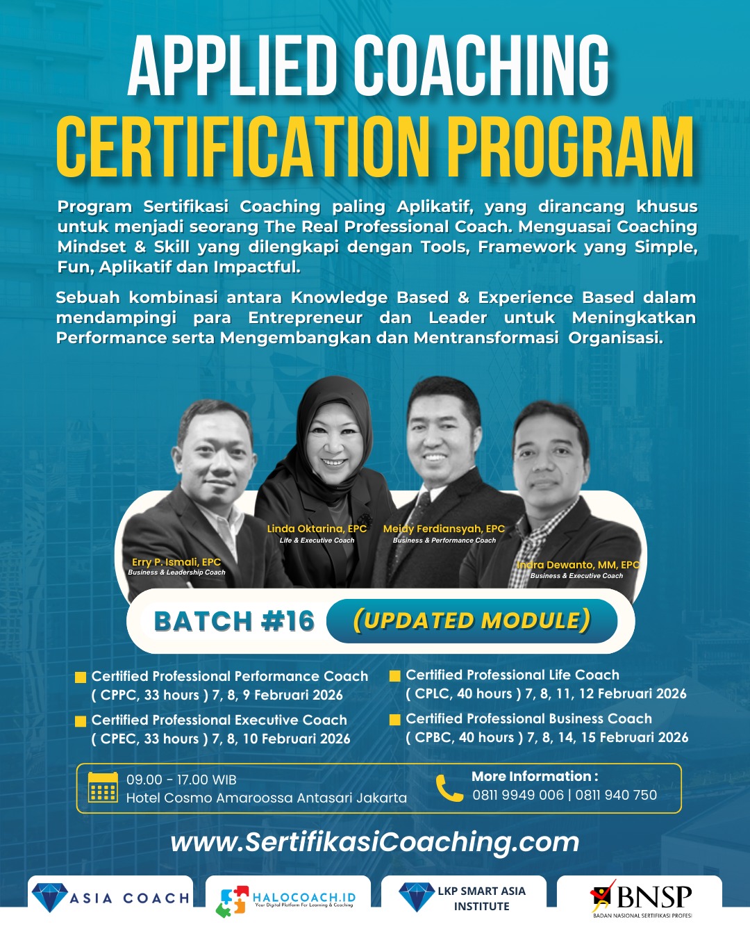“Saya jadi bisa melakukan self coacing untuk diri saya sendiri dulu. Tools yang diberikan Coach Erry ini luar biasa karena benar-benar sudah rapih, sudah siap tinggal di duplikasi dan di praktikkan. Thanks a lot Coach Erry, LUAR BIASA”